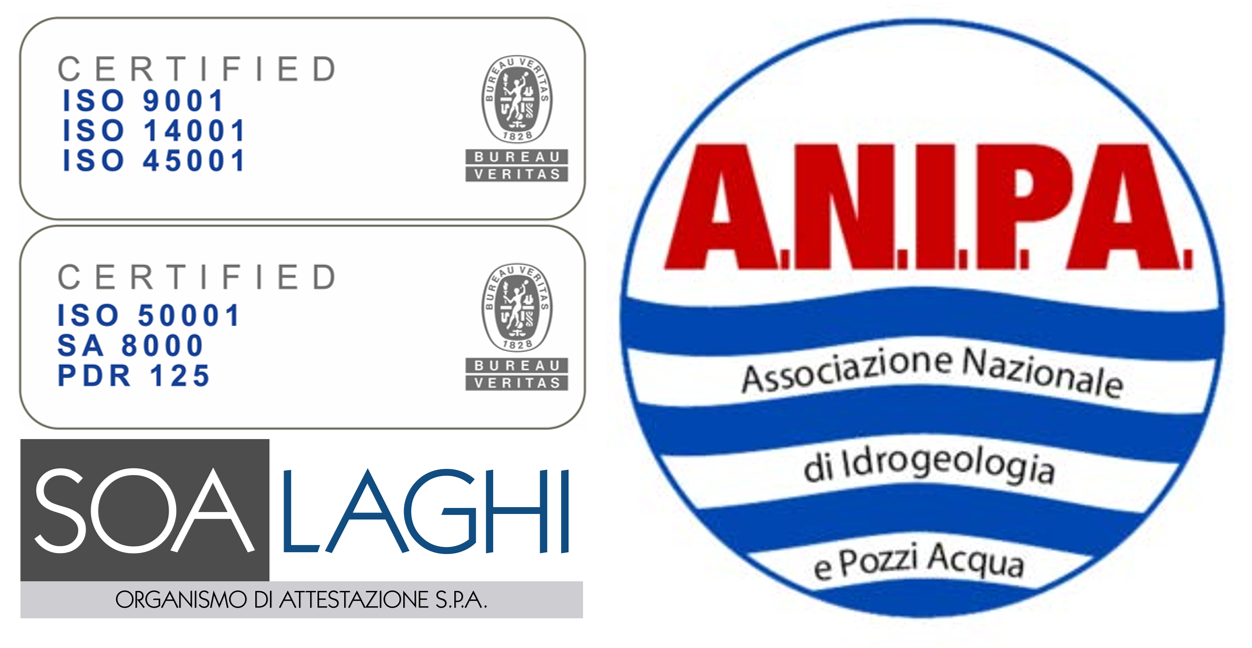 Artesia è un’impresa certificata ISO 9001:2015, ISO 14001:2015, ISO 45001:2018 e UNI PDR 125:2022, a garanzia del massimo rispetto sia delle promesse fatte ai nostri clienti sia della condizione di qualita’, sicurezza, ambientale e sociale. Abbiamo inoltre l’attestazione SOA per l’esecuzione di appalti pubblici e siamo soci ANIPA, l’associazione nazionale che rappresenta le maggiori imprese attive nel campo dell’idrogeologia, dei pozzi d’acqua e della geotermia.